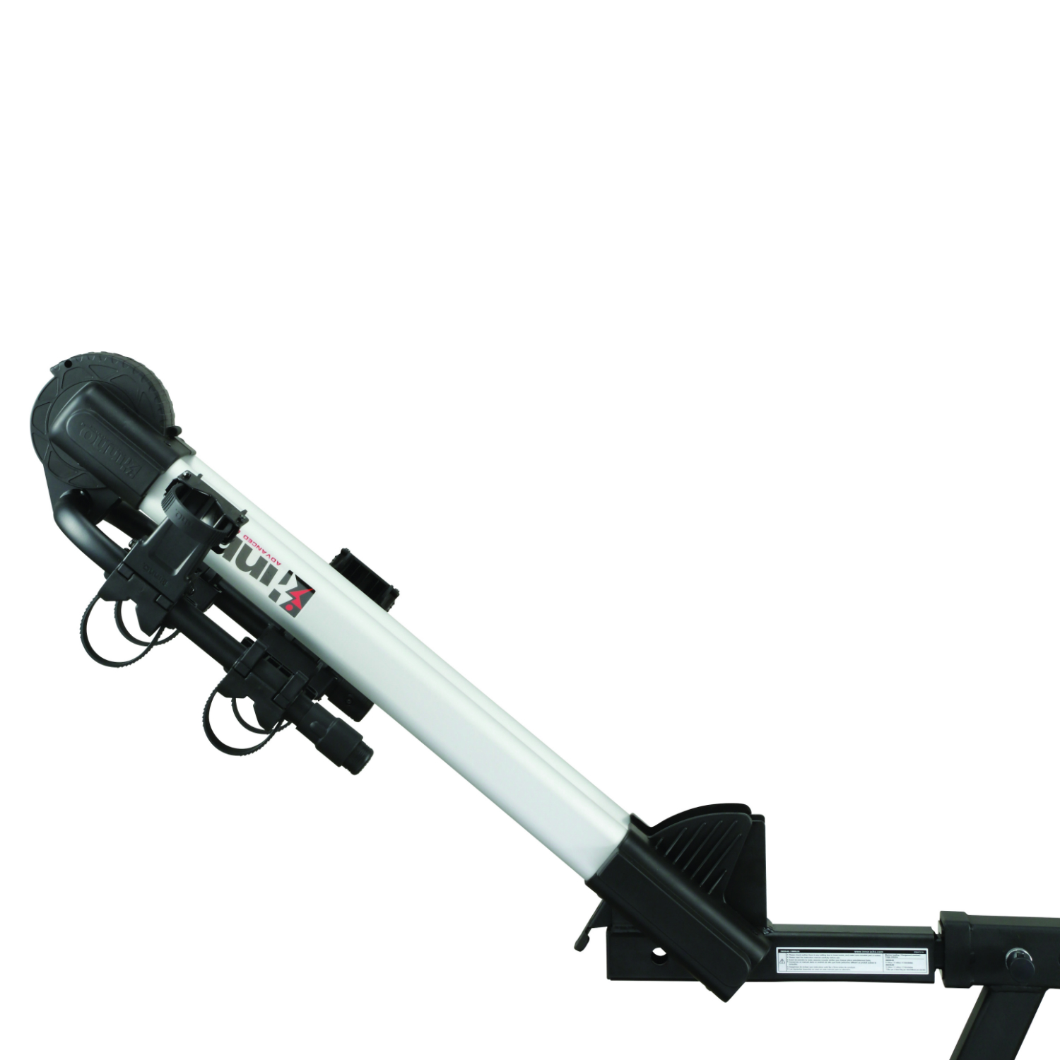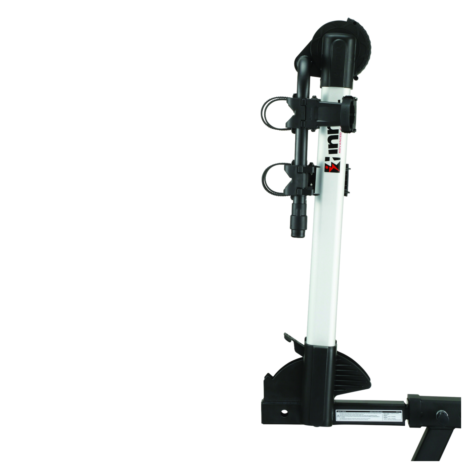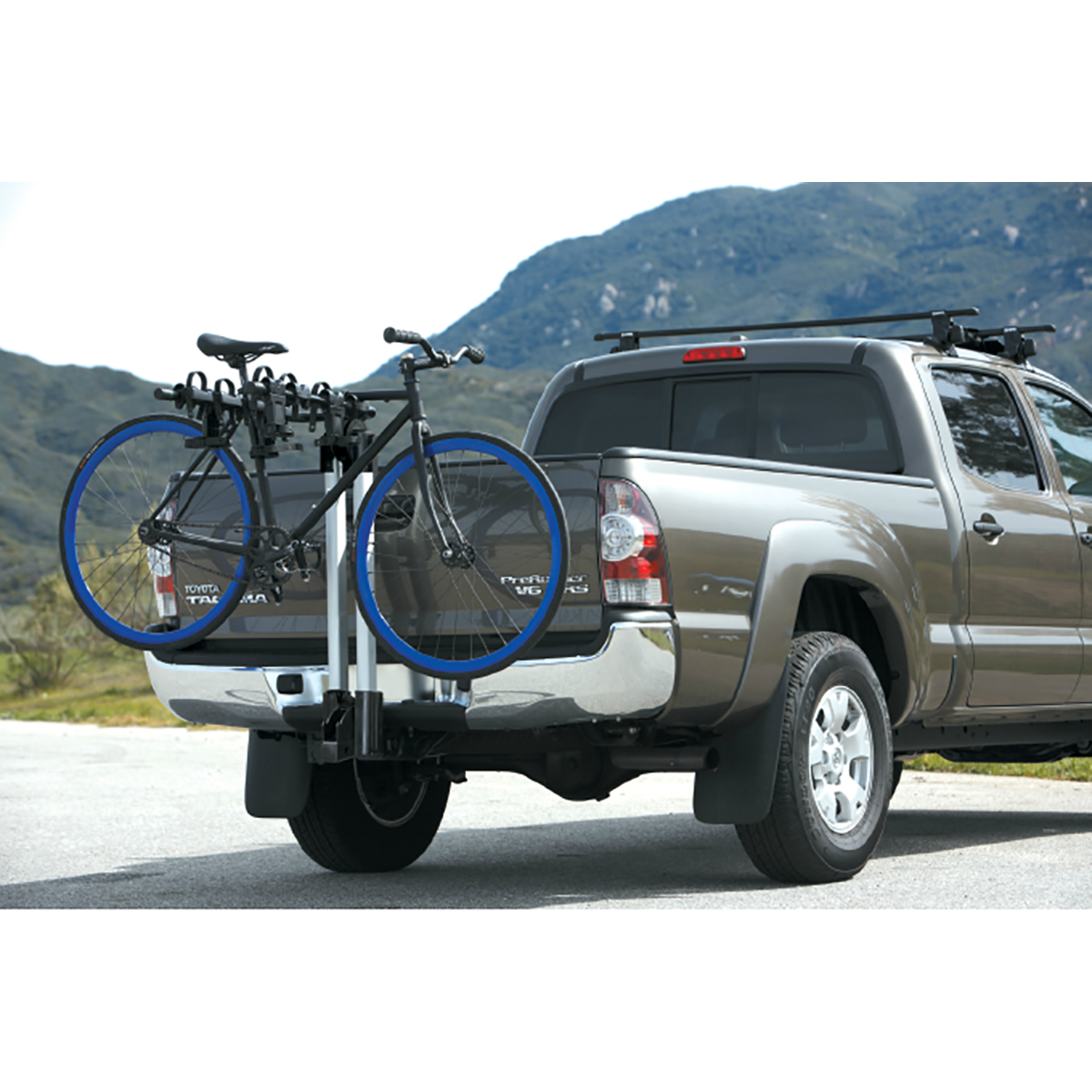 This rack extends 7 1/2 inches from the center of the hitch pin hole to the mast. You will have to measure the distance the rear tire extends past this same point to determine clearance Thank you for your question