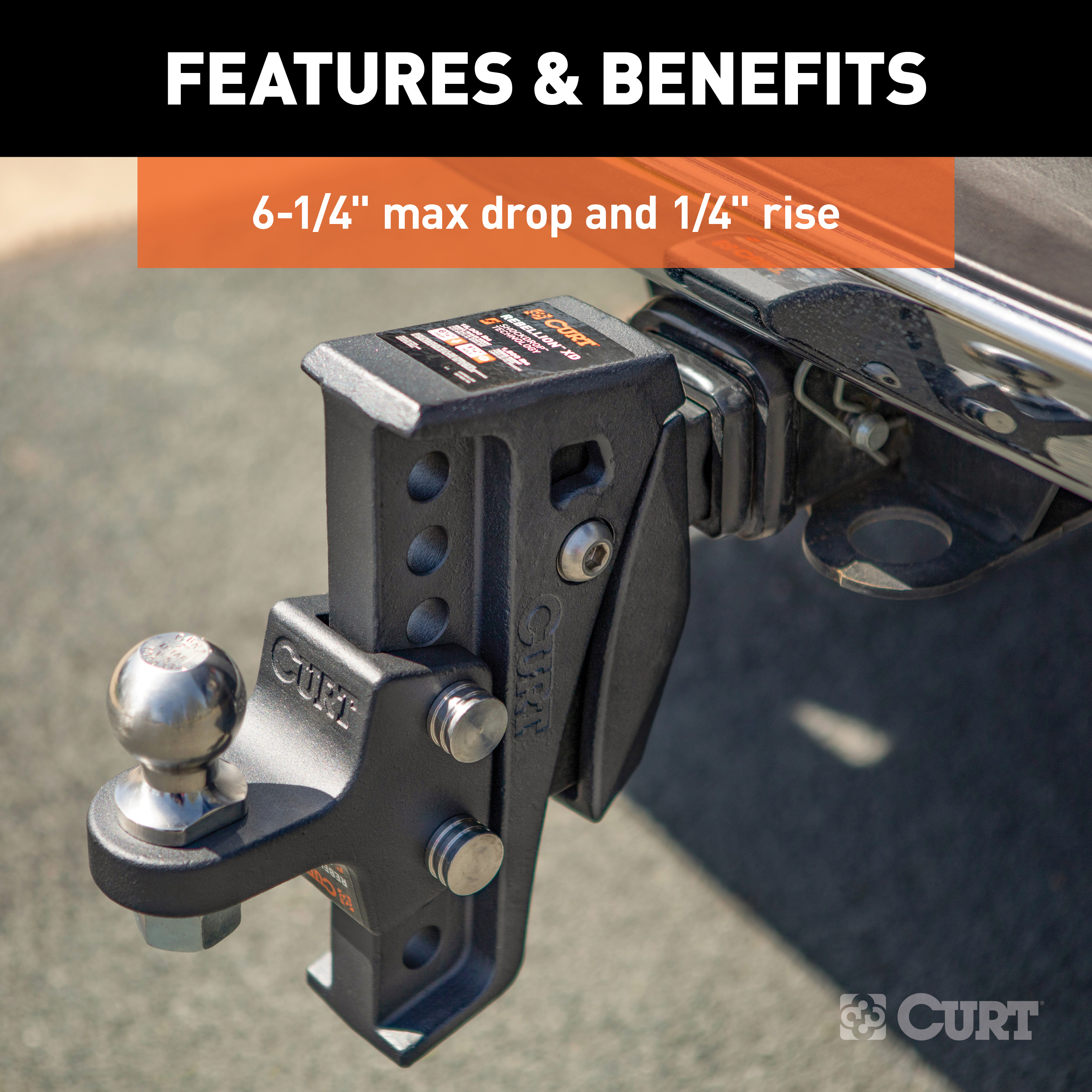 Curt’s Rebellion XD is a cushion hitch ball mount featuring ShockDrop technology and a cushion isolator that reduces rattling, vibration, noise, jerking, and jarring from bumps and potholes for a smoother towing. Cushion hitch ball mount is virtually maintenance-free with no airbag or bearings to service.