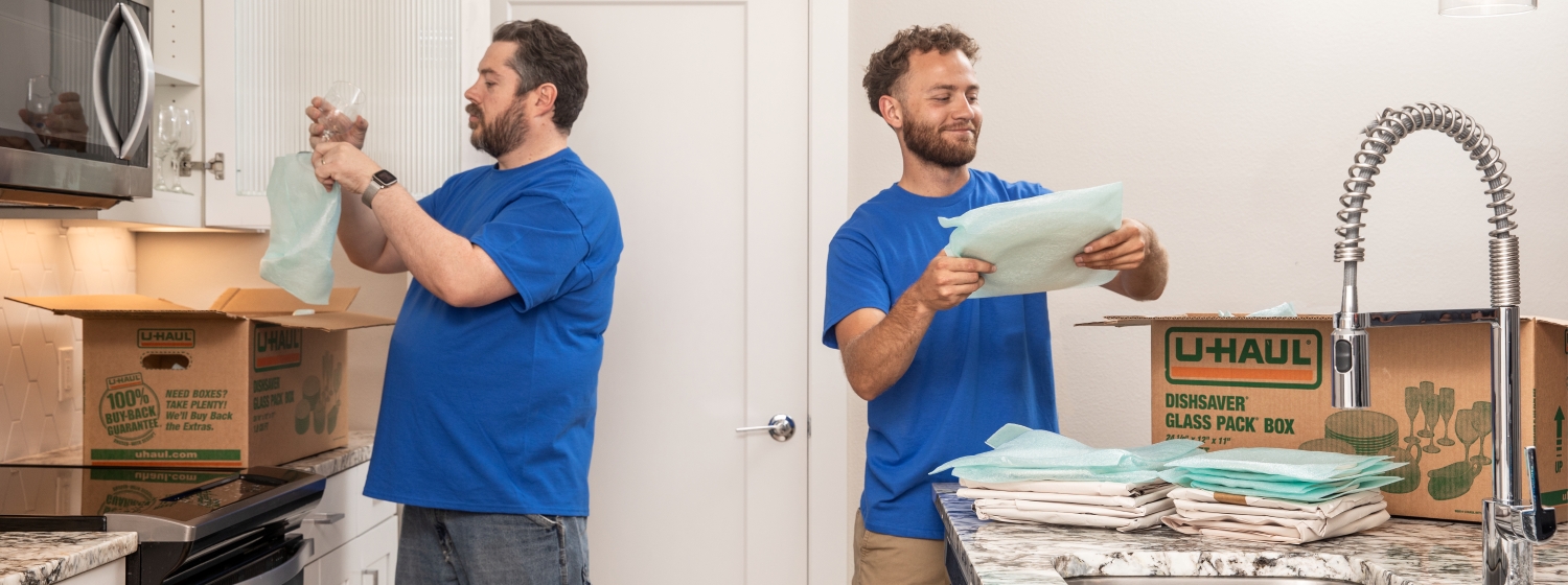 Invest in specialty boxes available at U-Haul centers, dealers and affiliates nationwide. These items are designed to specifically store, organize, and protect difficult items to pack such as glasses, dishes, etc.