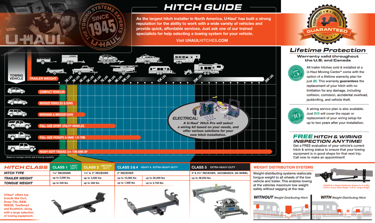 All trailer hitches sold and installed at a U-Haul Moving Center come with the option of a lifetime warranty plan that guarantees the replacement (including labor cost) of your hitch for any reason with no limitation on damages, including collision, corrosion, accidental overload, jackknifing, and vehicle theft. We also offer a wiring service plan that guarantees the repair and replacement (including parts and labor) of your wiring for any reasons including collision, corrosion, accidental handling, or damage for up to two years.