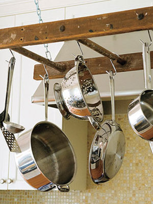 DIY pot rack: If you have a little time and a creative flair, you can make your own pot rack. This not only looks great, but also provides what I consider to be the easiest access for all of your pots and pans. You can see them all and choose which one you want to use, without having to remove the other pots or pans that are stacked on top.